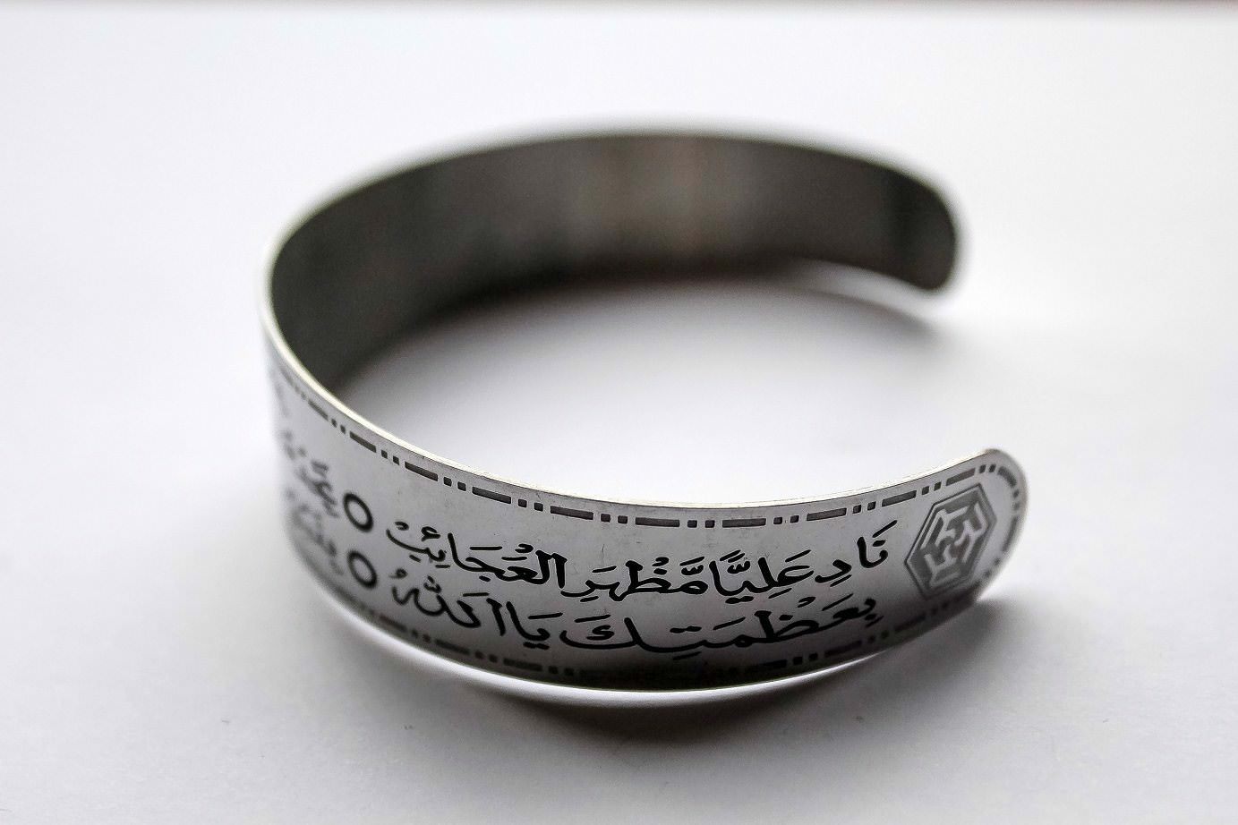 This type of ‘kara’ (wristband or bracelet) are popular among the Shia Muslims in the Indian subcontinent specially Pakistan. They come with various inscriptions and styles. This one has Naad-e-Ali inscribed on it (debosed on steel with colored paint filled in). This is a one size fits all adjustable wristband. Please note, we have similar style wristbands with other inscriptions, see Products listing.